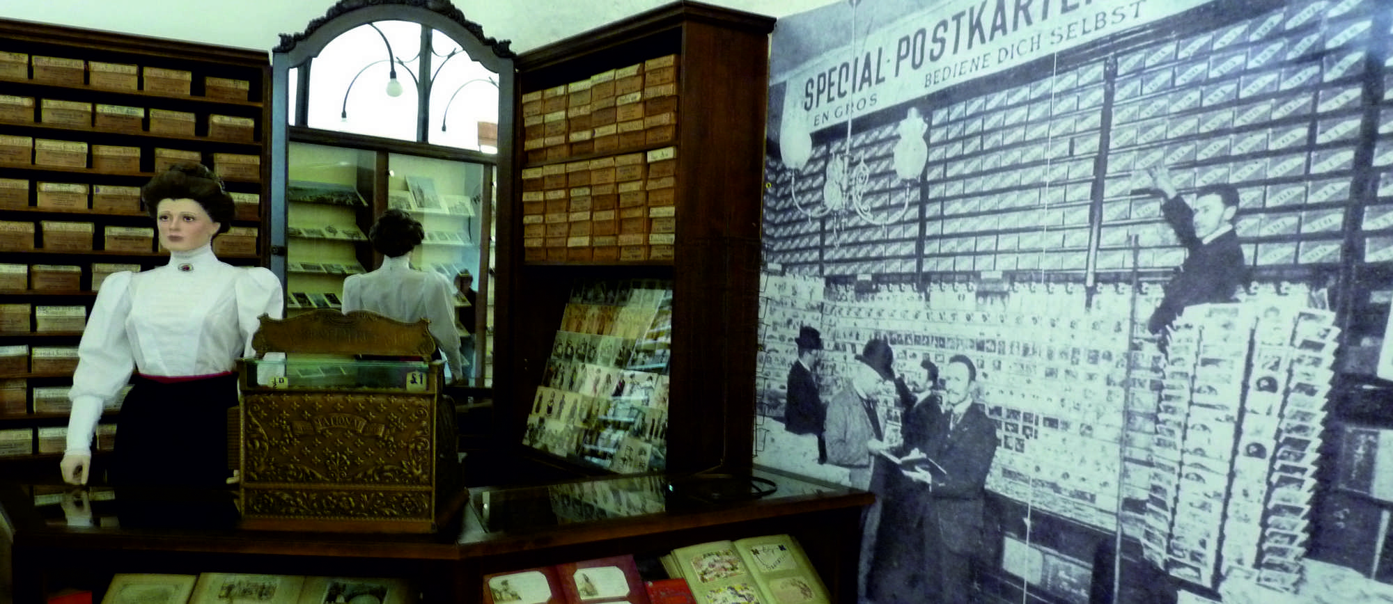 A kiállítás egységében felidézzük a képes levelezőlap történetét – a hirdetőoszlopra írt három nyelvű szöveg és egy audioeszköz által közvetített felvétel segítségével. Egy rekonstruált „papírnemű áruház” polcain és kirakatában megjelennek a legrégebbi lapok. Az „áruház” működő üzlet, ahol reprint lapokat vásárolhat a látogató. Egy régi postahivatalban pedig feladhatóak ezek a lapok, így szemléletesen bemutatjuk, „élővé tesszük” e termék funkcióját, hiszen az emberek az üzenetek eljuttatására használták, és használják ma is.
